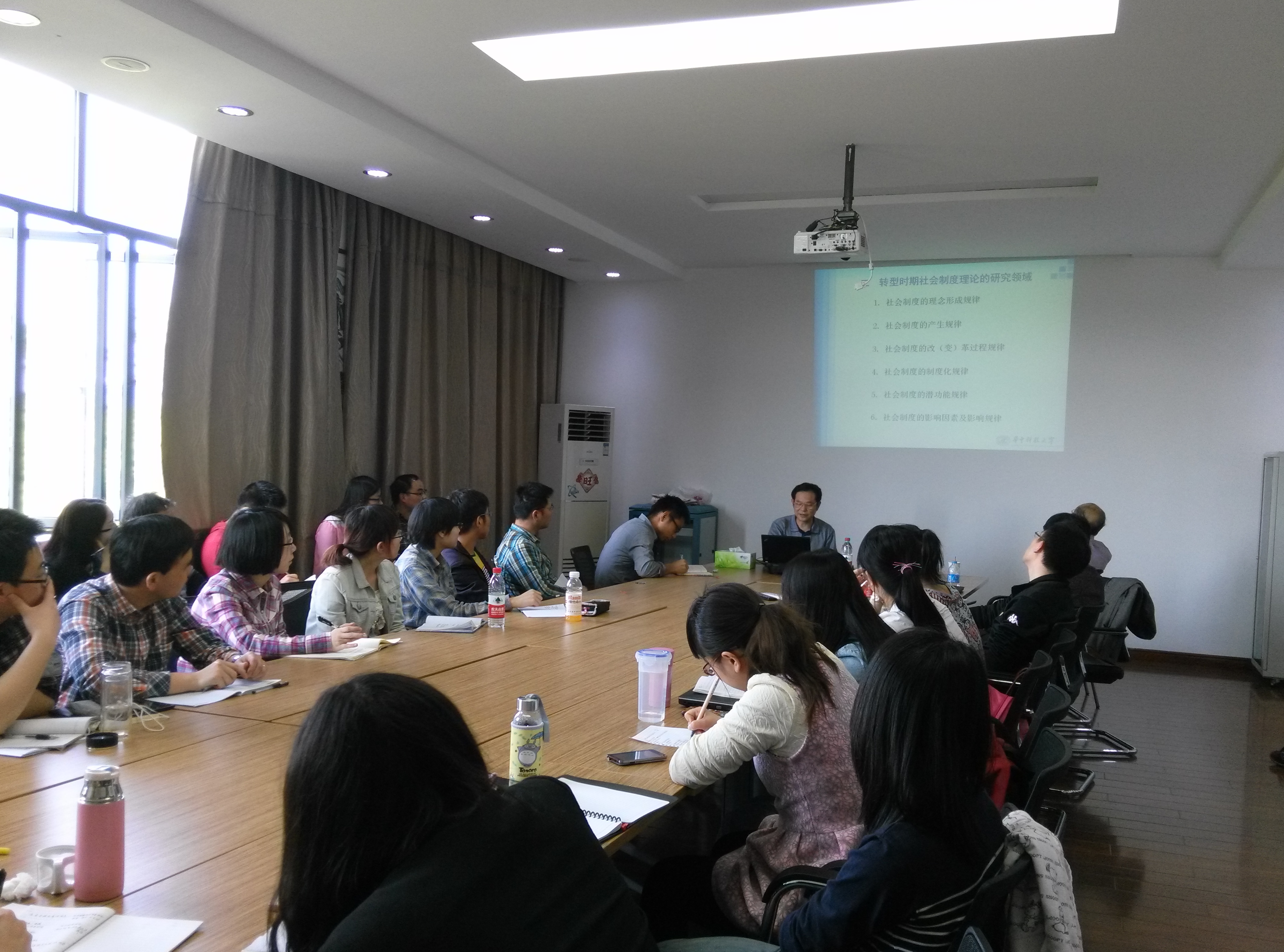 雷洪教授从转型期制度理论建设的缘由、制度建设的领域以及如何研究转型期社会制度理论三个方面对制度建设——这一转型期社会学理论前沿研究领域做了全面而深入的分析。在主题报告中,雷洪教授详细阐述了转型期社会制度理论研究的六大领域:社会制度理念的形成规律;社会制度产生规律;社会制度改革过程的规律;社会制度的制度化规律;社会制度的潜功能以及社会制度的影响因素及影响规律。雷洪教授认为,社会制度在实施过程中之所以会产生扭曲、偏移以及在制度执行中会发生功能递减等效应,皆源自于社会制度在制度化过程中产生了问题,因此制度的制度化是转型期社会学理论研究的重要议题。此外雷教授还指出,在社会制度制定过程中,必须全面评估制度可能引发的积极潜功能和消极潜功能,并做好消极潜功能的预警机制。主题报告结束后,雷洪教授还与部分师生就制度建设等问题展开了热烈讨论。