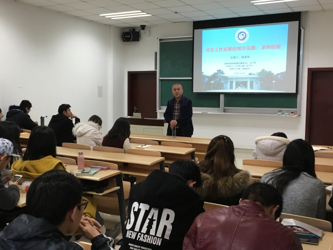 课堂开始,徐老师向大家介绍了这位“长者”的来历,之所以称为“长者”,一方面他确实是我们的前辈,另一方面,他满头银白色的头发让人觉得他年龄可能很大,但他却精气神十足。这位“长者”就是深圳市阳光家庭综合服务中心机构创始人、中国社会工作十大年度人物(2011年)、深圳市政协委员、南山区人大代表孙亚华理事长。孙总从自己与社会工作结缘的经历、从社会领域反观社会工作的功能定位、深圳社会工作的发展经验等方面为同学们进行了生动形象的分享。