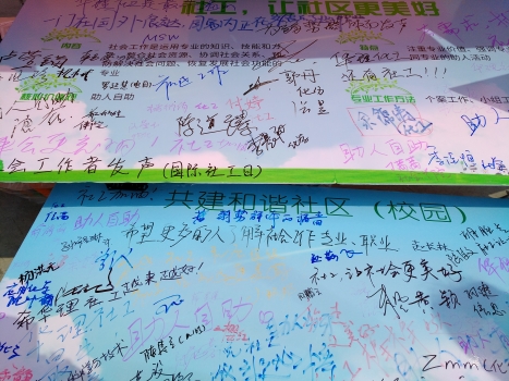 在宣传期间,多数参与者表示没有听说过“社会工作”,仅有几位了解社会工作的也将其与义工、志愿者混淆。于是员工们耐心地为大家答疑解惑,让更多师生知晓这一专业与职业。通过宣传,许多参与者十分认同社会工作的工作理念与内容,纷纷在留言板上留下了美好的寄语。