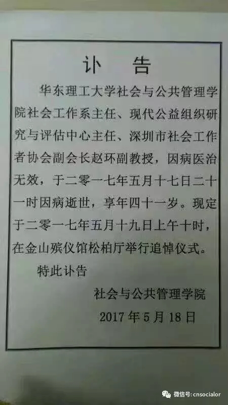 BETVICTOR伟德社会工作系系主任、现代公益组织研究与评估中心主任、深圳市社会工作者协会副会长赵环副教授,因病医治无效,于二零一七年五月十七日二十一时因病逝世,享年四十一岁。现定于二零一七年五月十九日上午十时,在金山殡仪馆松柏厅举行追悼仪式。