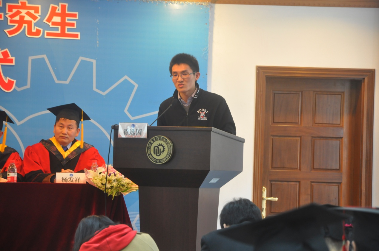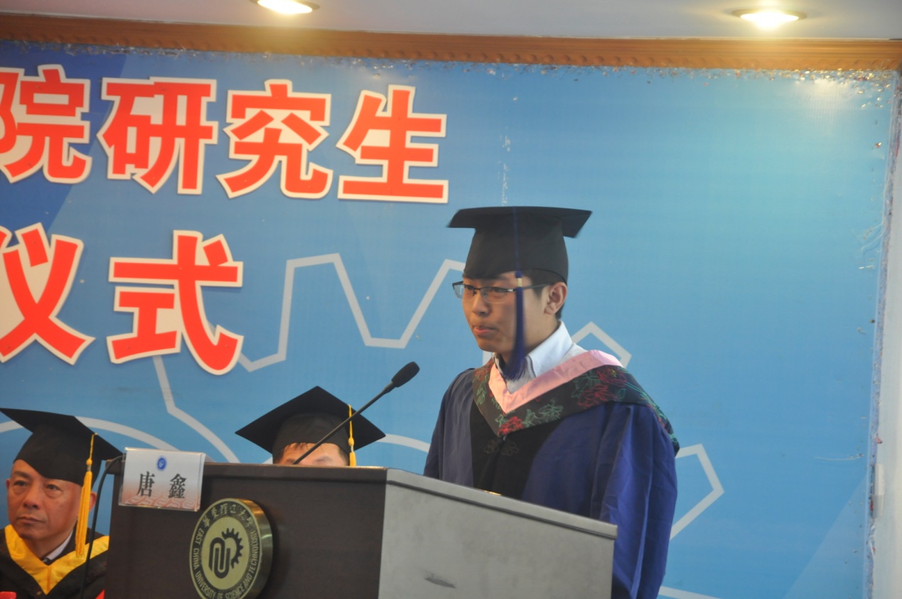 硕士生唐鑫作为毕业生代表发言。他回顾了两年半的研究生生活,对孜孜不倦的老师、朝夕相伴的同学、照顾支持的家长一一表示了感谢,表达了对母校的眷恋与依依不舍,并祝愿全体毕业生一帆风顺、前程似锦。