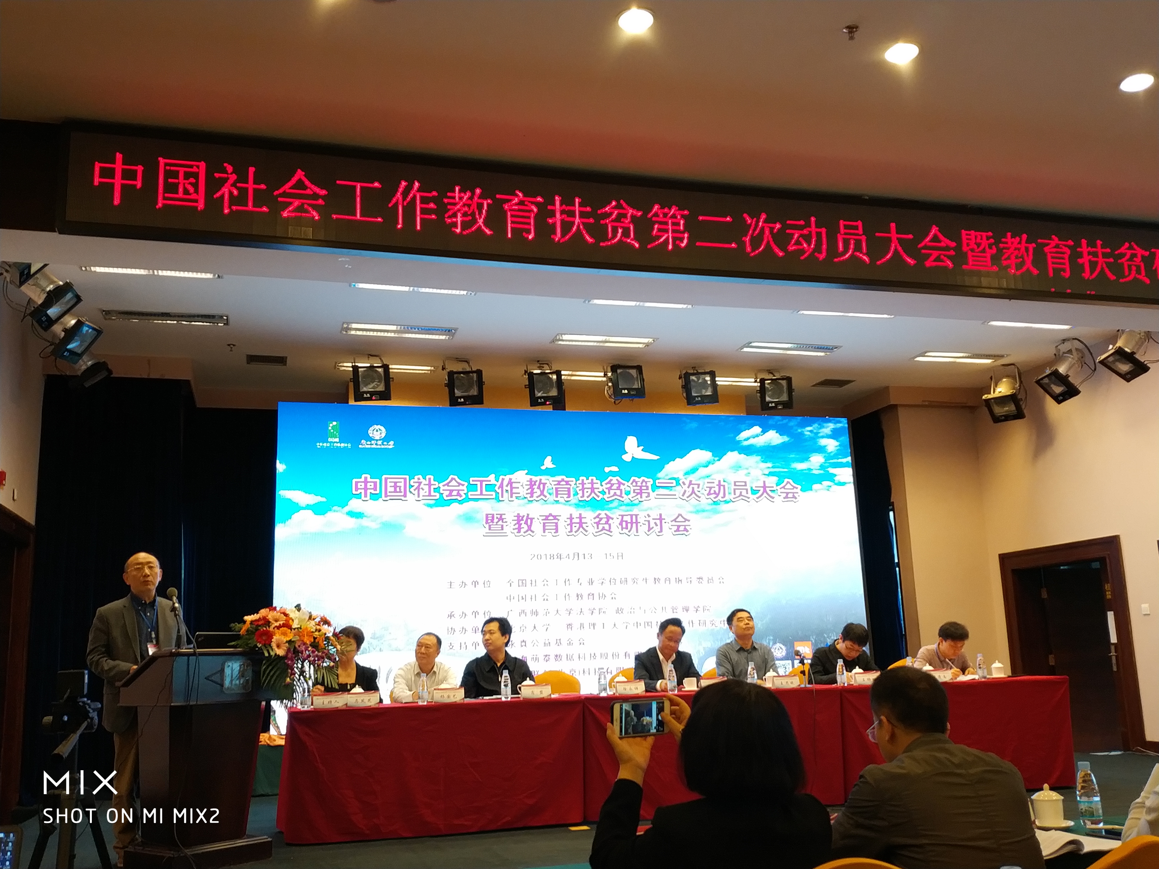 北京大学王思斌教授、广西师范大学林春逸副董事长、广西壮族自治区民政厅社会组织管理局(社会工作处)黄清南调研员、广西壮族自治区扶贫办杨国艺副巡视员、国务院扶贫办社会扶贫司宿盟科长、民政部社会组织管理局(社会工作司)王铮键处长也进行了主题发言和动员讲话。经过大会动员和自主申报,会议成功促成了中央民族大学等90所社会工作院校与贫困地区和贫困县建立了对口扶贫关系。
