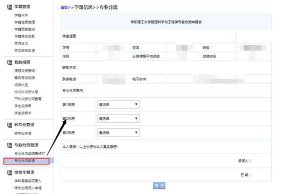 4、点击【学籍成绩】-【专业分流申请】,成绩单核对无误后,在此页面可查看个人在大类内的成绩排名,同时可在线对分流志愿进行填报申请。志愿处下拉选择对应专业即可,确认后点击提交按钮进行提交。(注意:一旦提交,志愿将不能再做修改!)
