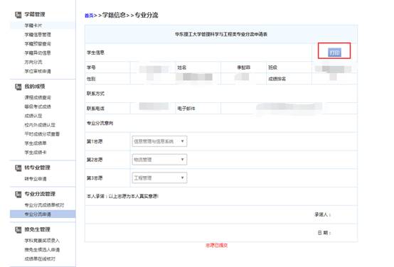 提交后右上角会出现打印按钮,点击打印即可将专业分流申请表导出,如下图所示
