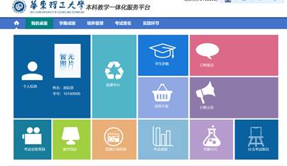 主菜单有:我的桌面、学籍成绩、培养管理、考试报名、实践环节等