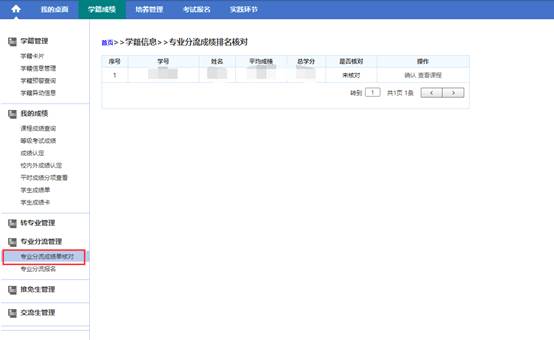 3. 点击菜单【学籍成绩】-【专业分流成绩单核对】,可在此对公司所设置的平均成绩进行确认,如下图所示点击查看课程能对参与计算的课程以及成绩进行查看,核对无误后点击确认即可