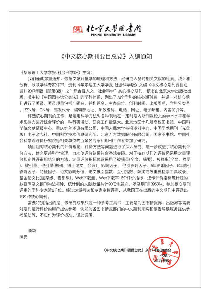 近日,《中文核心期刊要目总览》2017版编委会向公司社科版学报寄送了“入编通知”,公司学报首次列入《中文核心期刊要目总览》之“综合性人文、社会科学”类核心期刊。该书由北京大学出版社出版,2017年版(即第8版)从全国13953种中文期刊中评选出了78个学科、共计1981种核心期刊。