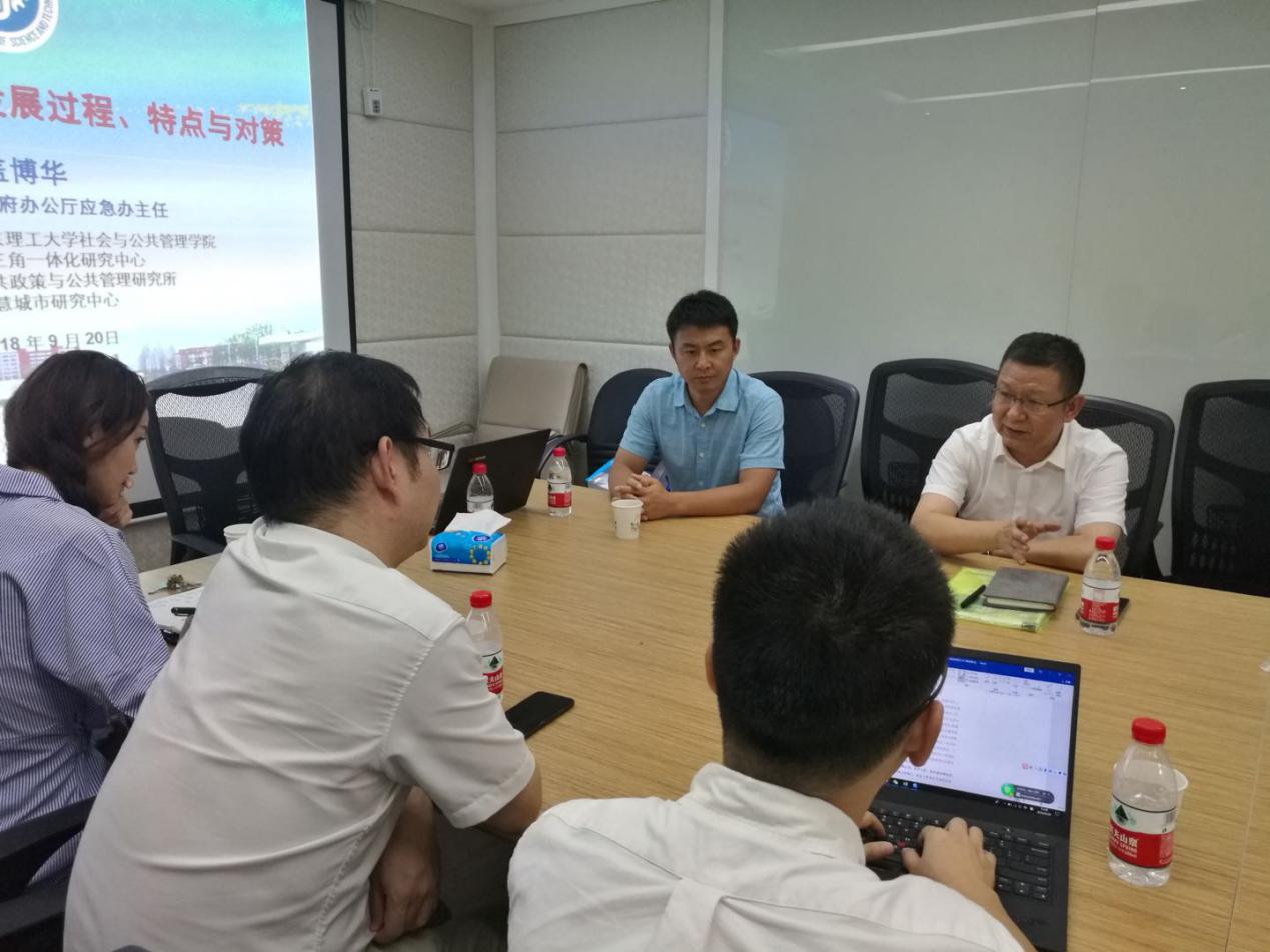 报告结束后,公司纪晓岚教授、唐有财处长,就长三角一体化推进过程中的应急管理问题以及未来的合作事宜与盖博华主任展开了深入的讨论与交流。