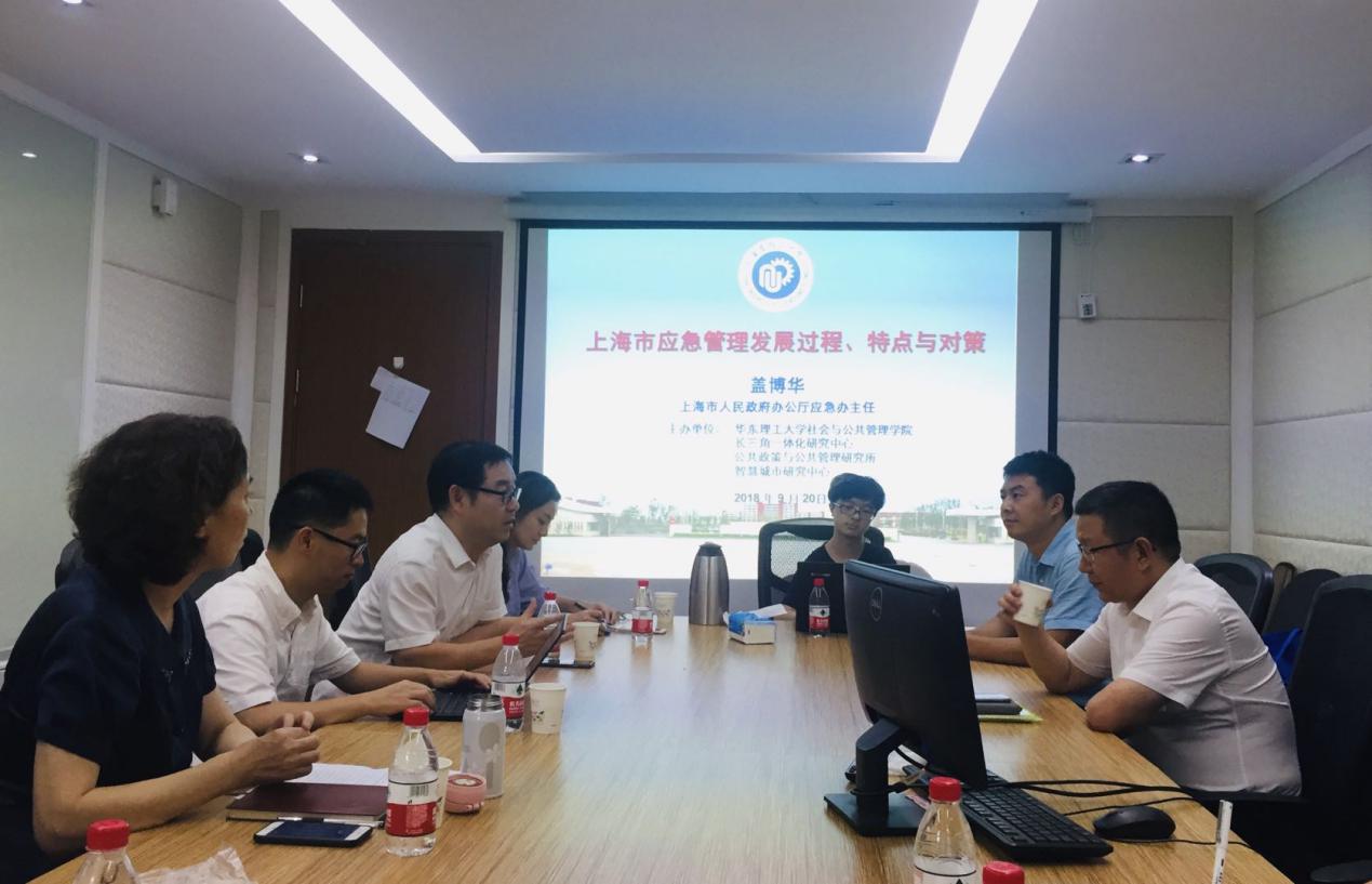 2018年9月20日下午,公司长三角一体化研究中心、公共政策与公共管理研究所以及信息公司智慧城市研究中心联合举办的长三角一体化系列高层论坛第七讲在BETVICTOR伟德318会议室顺利举行。本次论坛邀请了上海市人民政府办公厅应急办主任盖博华做题为“上海市应急管理主要经验与对策”的主题报告。公司长三角一体化研究中心主任纪晓岚教授、人文社科处副处长唐有财教授、公共政策与公共管理研究所所长罗建平教授,信息科学与工程公司智慧城市研究中心主任赵文瑜教授,长三角一体化研究中心团队全体成员及博士、研究生参加了会议,会议由纪晓岚教授主持。