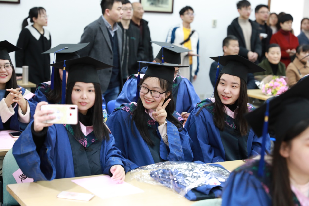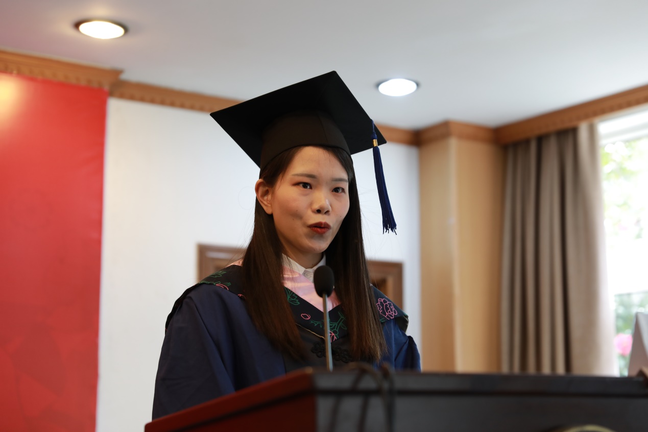 行政管理专业罗双双作为毕业生代表发言。她简要回顾了短暂而充实的硕士学习生涯,犹念谆谆教诲的每位老师,一同相伴成长的同学和默默在背后支持的家长,并衷心祝愿老师们身体健康,毕业生们前程似锦。