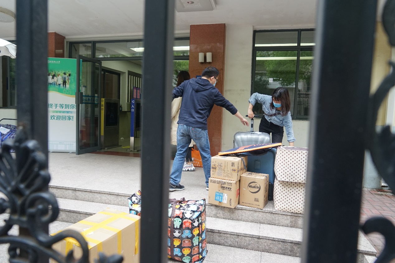 【图片说明】留校博士生陈魏和大四员工哈德斯主动报名作为员工志愿者参与到当天的离校工作中,帮助毕业生搬运、整理行李