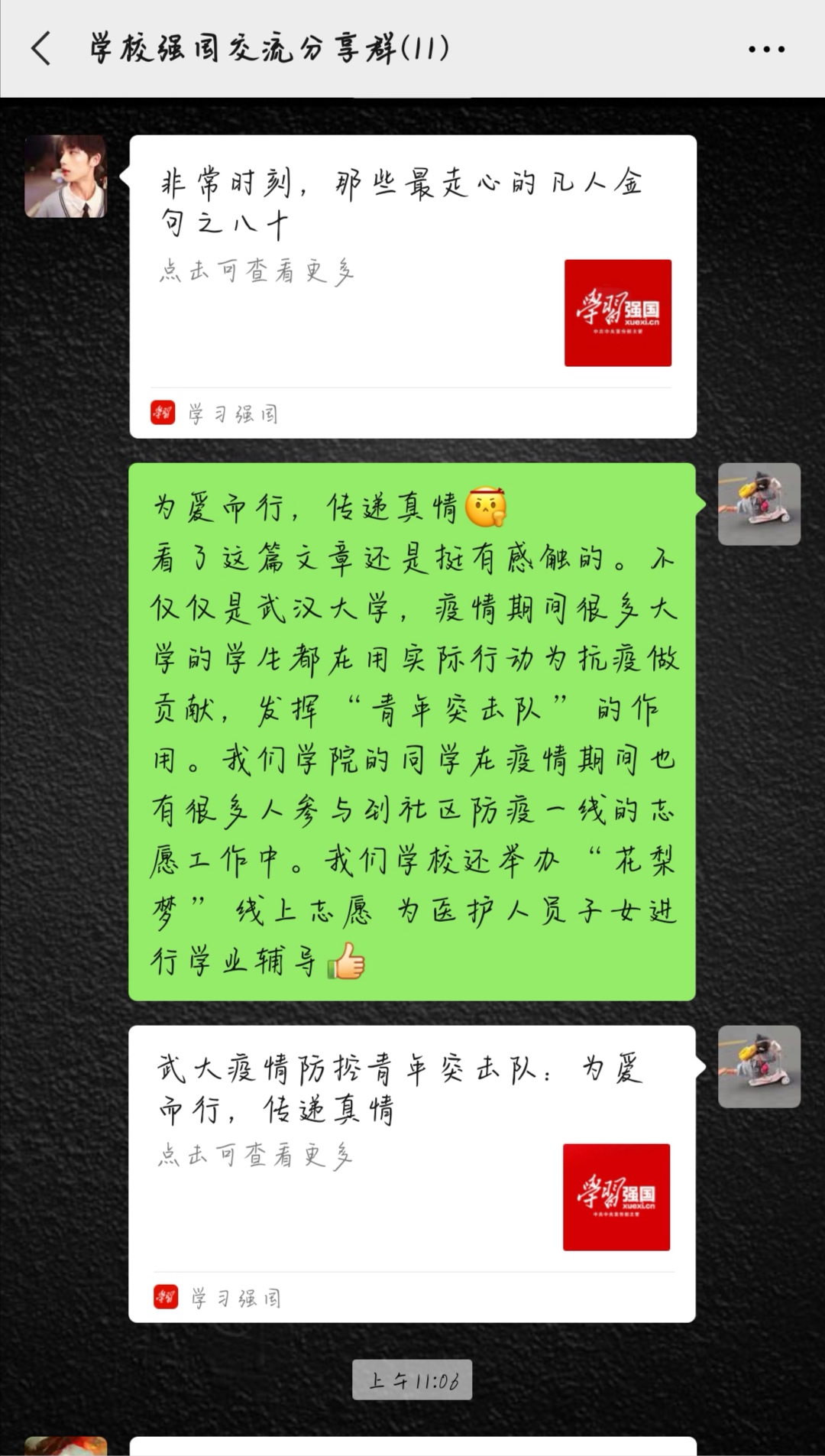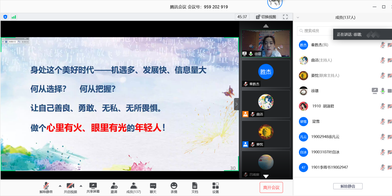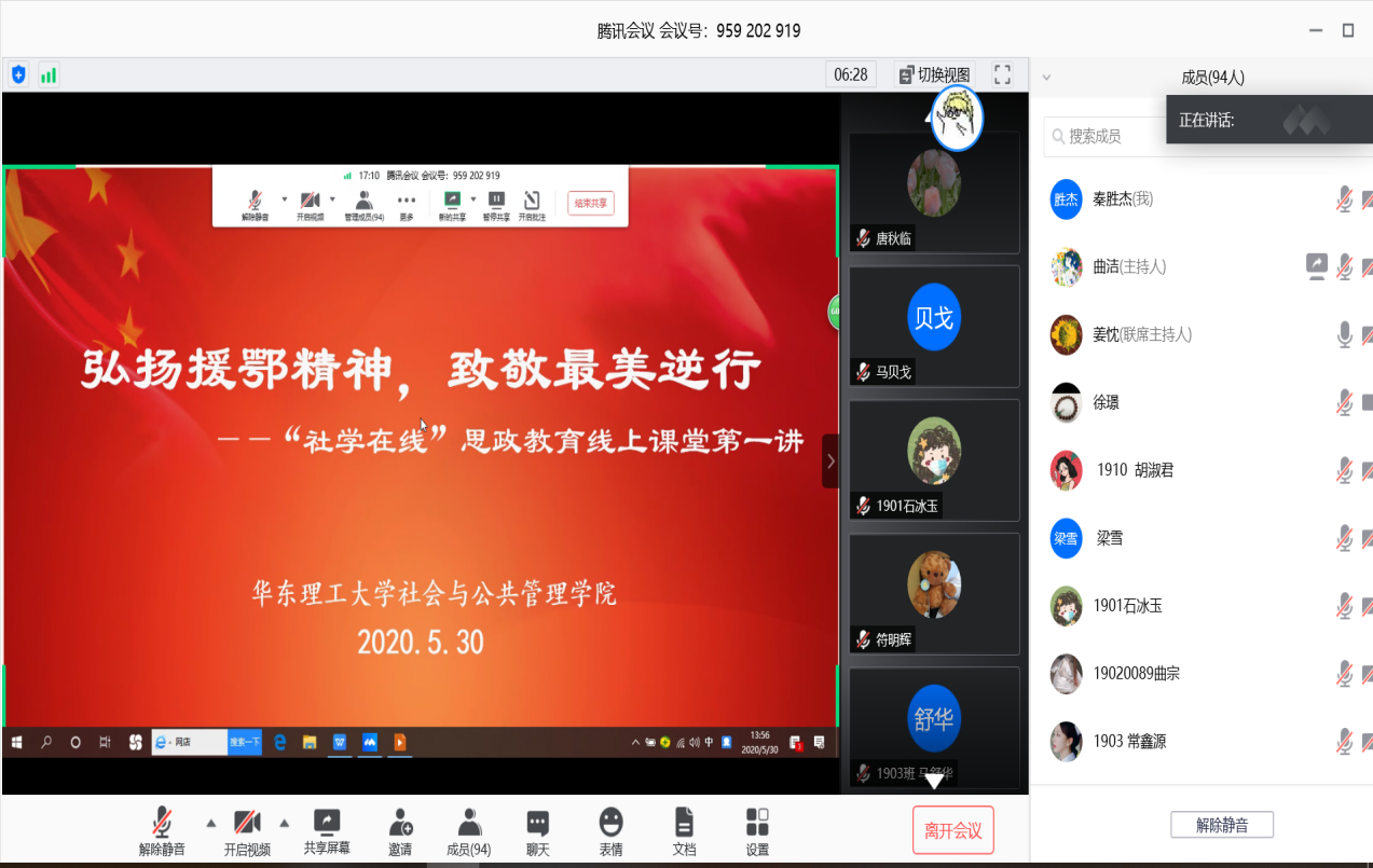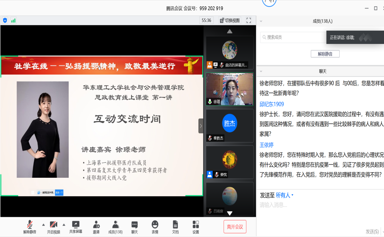 除此之外,为鼓励入党积极分子认真学习抗疫英雄事迹,引领入党积极分子读懂中国战“疫”这本无字之书,530日下午,社会公司入党积极分子培训班开展“弘扬援鄂精神,致敬最美逆行”线上课程。活动邀请上海第一批援鄂医疗队成员,复旦大学附属中山医院护士长徐璟作为主讲嘉宾分享抗疫故事、交流抗疫感悟。在互动交流时间,大家结合专业关注战疫过程中的心理情况,学习实践中的管理知识等积极提问,并送上对抗疫一线医护者最崇高的敬意,徐璟也结合自身医务人员经历和抗疫感悟对同学们的提问进行了细致真诚的回答,并在最后向在场所有入党积极分子寄语。