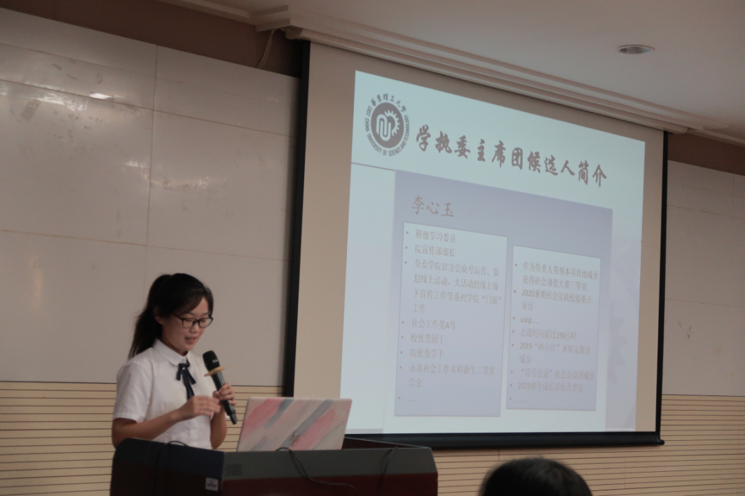 计票期间,员工会主席胡江越同学作员工会工作报告《迎接挑战 砥砺前行 做新长征路上奋发有为的社院人》。胡江越主席回顾了员工会这一年的工作,针对学术部、生活部、外联部、文艺部、体育部和社团发展部六大部门进行总结,并提出对之后一年员工会工作的展望和规划。