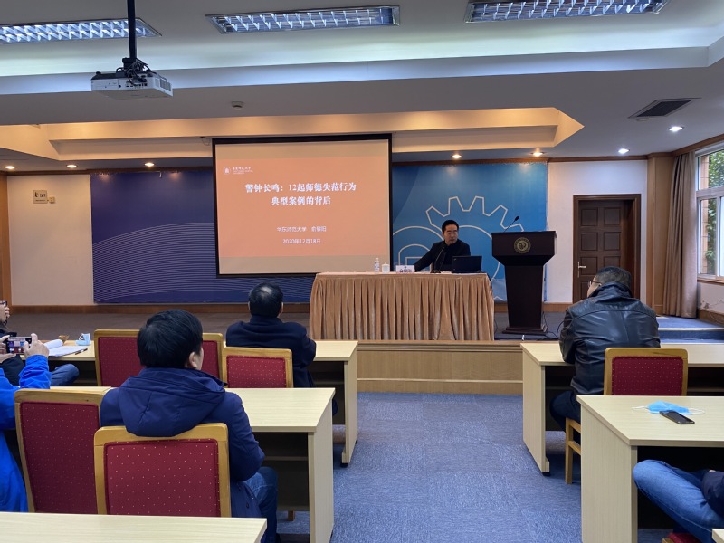 12月18日下午,公司在逸夫楼演讲厅举办师德师风专题讲座。作为公司“师德师风主题教育月”重要内容之一,活动特邀华东师范大学纪委副书记、监察处处长俞黎阳博士为社会公司教师作了题为“警钟长鸣:12 起师德失范行为典型案例的背后”的专题讲座。党委书记张广利主持讲座,公司全体教职员工参加。