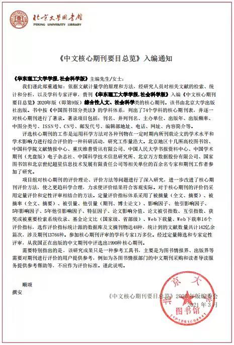 3月8日,《中文核心期刊要目总览》2020版编委会向公司寄送了“入编通知”,《BETVICTOR学报》(社会科学版)入编《中文核心期刊要目总览》2020年版(即第9版)综合性人文、社会科学类的核心期刊。该书由北京大学出版社出版,2020年版从全国13764种中文期刊中评选出了74个学科、共计1990种核心期刊。中文核心期刊的评选工作,是运用科学方法对各种刊物在一定时期内所刊载论文的学术水平和学术影响力进行综合评价的一种科研活动。北京大学核心期刊评价项目组采用了被摘量、被摘率、被引量、他引量、影响因子、基金论文比等16个评价指标,选作评价指标统计源的数据库及文摘刊物达48种,统计到的文献数量共计142亿余篇次,采用定量筛选和专家定性评审的方法,评价过程科学合理,评价结果能较为客观真实地反映期刊的学术水平和影响力,是目前全国各大高校及科研机构普遍认可的期刊评价指标体系。