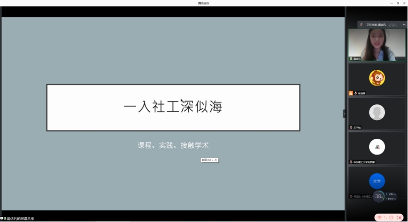 讲座前半部分,漏依凡分享了自己丰富的华理本科学习、实践和学术训练点滴,回应了与华理老师相处的温暖日常,本科毕业后顺利攻读美国芝加哥大学社会工作硕士学位,目前正在攻读哥伦比亚大学社会工作学博士,主要研究兴趣为临终关怀,老年病末期照护,及医疗抉择和规划,她的整个硕士、博士学习过程印刻着深深的华理社工印记。