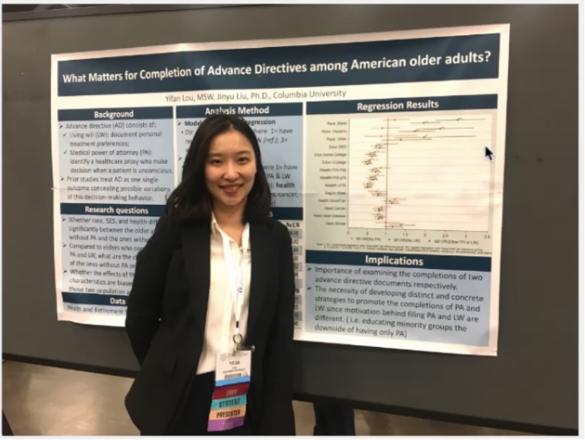 随后,依凡介绍了在芝加哥大学期间由实践、课程与研究助理构成的充实的MSW生活图景,硕士期间的问卷设计与制作经历让她走进了学术大门,愈发找寻到到研究的乐趣。再经过明确的职业规划之后,选择进一步攻读哥伦比亚大学社会工作博士,层层递进研究推进计划体现出她训练有素的学术品质,硕博期间已取得一系列研究成果。硕士期间获得芝大社会服务与管理公司专项奖学金、C. W. Chan奖学金,并先后在芝大医公司、精神健康和文化实验室担任研究助理。博士期间获得全额奖学金、Phyllis & Joseph Caroff奖学金,其独立研究项目多次获得哥大亚洲研究中心专款经费资助。目前已在临终关怀领域以第一作者或主要作者发表多篇论文,期刊包括《Journal of Pain and Symptom Management》(SCI);《OMEGA-Journal of Death and Dying》(SSCI)、《Aging and Mental Health》(SSCI)等,并多次在美国老年学学会、社会工作学会学术会议上进行交流。同时,她有七项研究先后在美国老年学会大会上展示(五项一作)。她目前还是哥大中国中心、哥大人口研究中心、Sasakawa社会政策基金会、及美国老年社会工作学会的研究员。