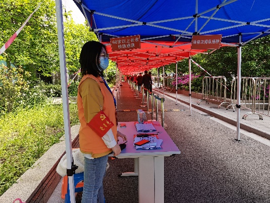(图为预备党员牛国玫在三江路疫苗接种点通道入口负责引流与登记)