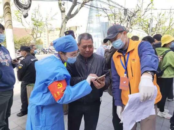 (图为志愿者领队预备党员赵凌云在三江路疫苗接种点入口帮助市民线上预约接种)