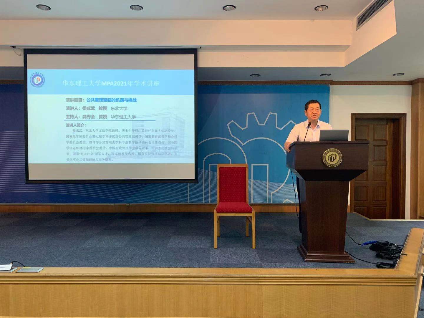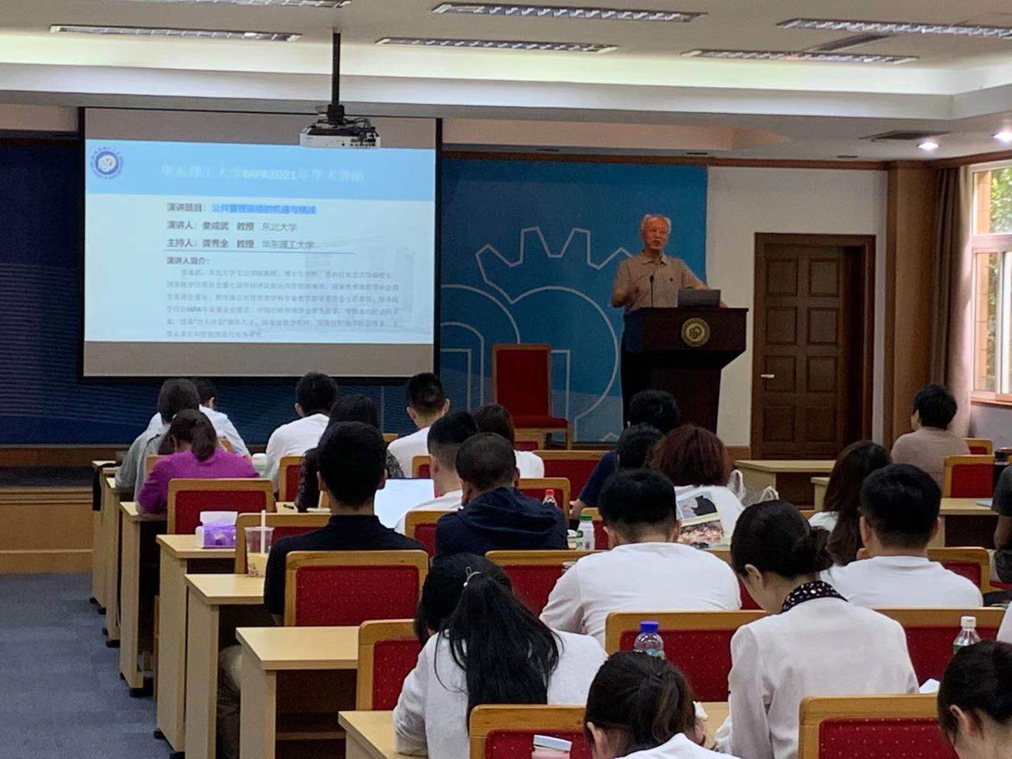 5月16日下午,公司特邀东北大学文法公司教授、博士生导师娄成武莅临公司,在徐汇校区逸夫楼一层演讲厅开展了以“公共管理面临的机遇与挑战”为题的讲座。娄成武教授曾担任东北大学副董事长、国务院学位委员会第七届学科评议组公共管理组成员、教育部哲学社会科学委员会委员、教育部公共管理类学科专业教学指导委员会主任委员、国务院学位办MPA专家委员会委员、中国行政管理学会常务理事,中国杰出社会科学家,国家级教学名师,国务院特殊津贴获得者,主要从事公共管理理论与实务研究。讲座由公司MPA中心主任龚秀全教授主持,公司师生100余人参加了本次讲座。