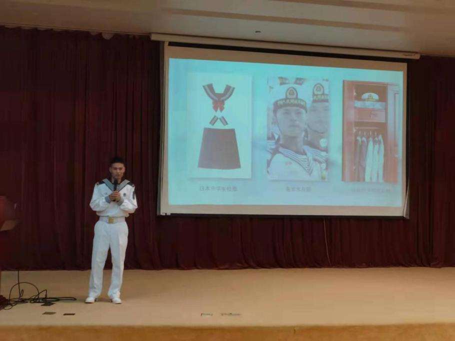 图片说明:退伍老员工党员齐汉运为大家讲解海军制服