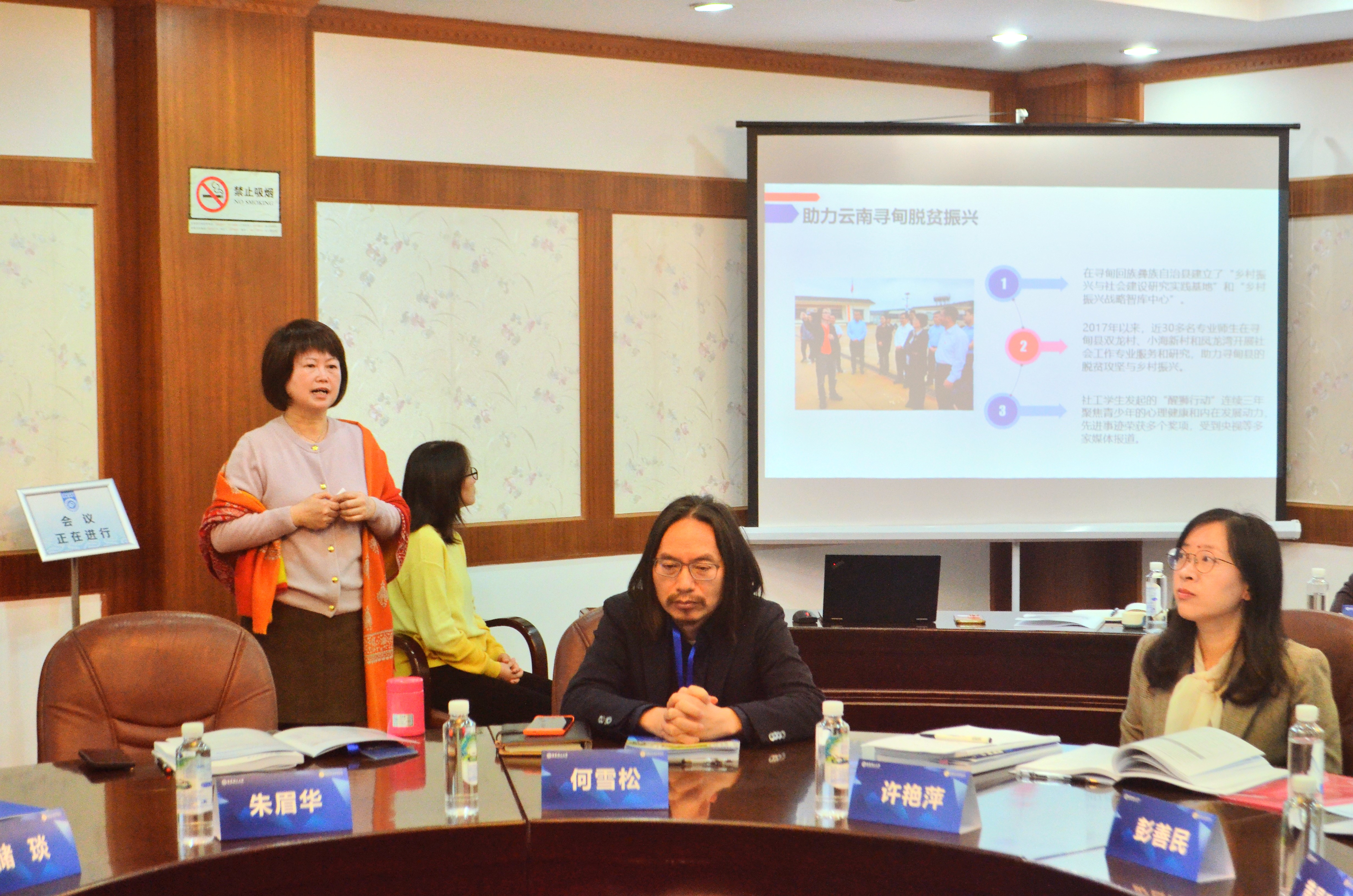 社会工作专业负责人朱眉华教授从专业概况、培养目标、毕业要求、课程体系、团队队伍、员工发展和特色项目等方面向专家组全面介绍了社会工作专业的自评情况。