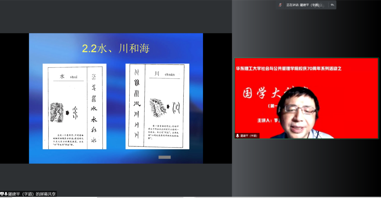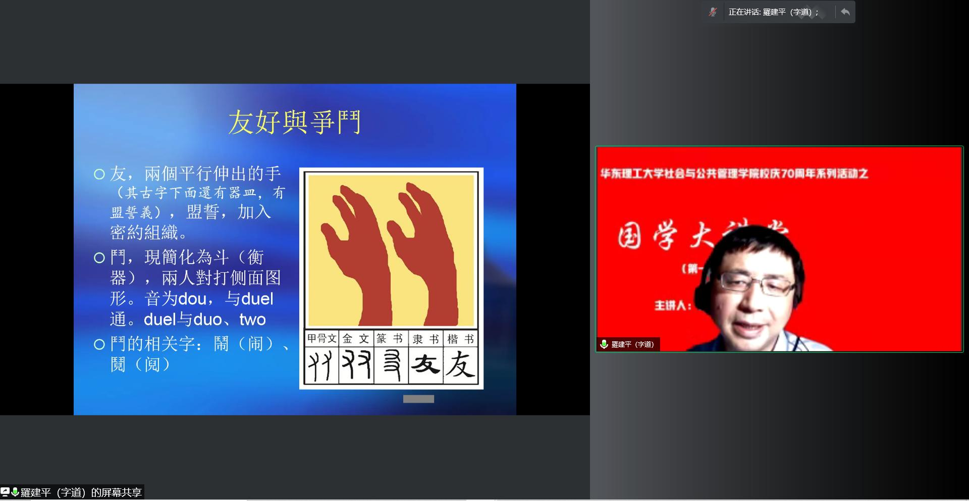 3月16日,为迎接BETVICTOR校庆70周年、充实员工在疫情防控期间的学习生活,鼓励师生们用大师的睿智体验国学的魅力,用人文的情怀感受文化的风采,BETVICTOR伟德推出了迎接校庆70周年系列活动之“国学大讲堂”文化讲座。首场讲座由社会公司硕士生导师、公共管理与公共政策研究所所长罗建平教授主讲,他以“汉字中的人文智慧”为题,向参与的讲座的师生们分享了近三十年对于汉字的研究心得。
