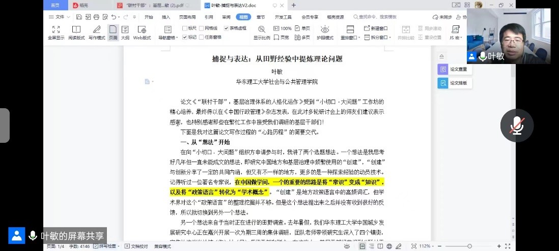 叶敏副教授以《基层治理经验研究的心得体会》为主题,介绍了《“联村干部”:基层治理体系的人格化运作》一文写作以及在《中国行政管理》投稿发表过程。叶敏老师介绍自己从“想法”开始,向《中国行政管理》组织的“小切口·大问题”工作坊提交了两个选题想法,随后开始不断反思的成稿与“痛苦”的修改过程。叶敏老师强调从文献中捕捉经验,梳理理论脉络,并形成新的想法,论文成稿之后需要进行反反复复的修改。最后,叶老师分享了“三法”协同的写作体悟,即文章要有有意思的“想法”,在概念上有经得起推敲的“说法”,还要在经验和理论融合上选择适当的“写法”。