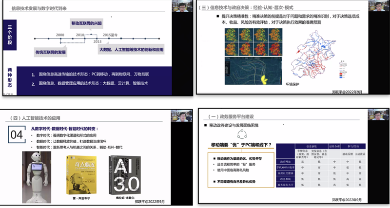 郑跃平副教授在“信息技术发展与数字时代到来”这一时代背景下,围绕信息技术与政府决策、信息技术与政府监管、数字治理等方面展开演讲。政府改革背后非常重要的一个驱动力就是技术,信息技术改善了政府决策、监管的效率和效果,但是郑跃平副教授指出数字化政务服务存在的一些问题并介绍数字化对公共治理的积极作用和消极作用。郑教授认为,目前政务服务数字化探索还存在服务体系不强、效果不好,政务服务平台建设浮于表面,内容有效度需要提高、跨层级统筹面临阻碍、隐私泄露等等问题。之后,郑教授介绍了人工智能技术的应用,其三种基础技术:语音识别、自然语言理解和计算机视觉,阐述了智能化政务服务存在的问题以及可能带来的社会风险。最后,针对“矛盾、张力与适应性治理”这一话题,郑跃平副教授表示要重新理解数字时代信息技术的角色,明确“技术-环境-治理”关系与适应性治理的内涵与价值、增强环境感知和知识学习能力、探索有效的治理网络、建立有效、多元、协同的治理机制等。信息技术带给公共治理的影响是多方面的,包括政府内部管理和运行、公共服务提供、网络参与、行政体制改革等,技术变化带给治理结构、过程和性质等的影响将是学术研究和政府创新的重要议题。郑跃平副教授的分享既有前沿的理论阐述又有详细的案例分析,中间多次给大家介绍了相关的经典著作,给全体师生带来了一场学术的盛宴。
