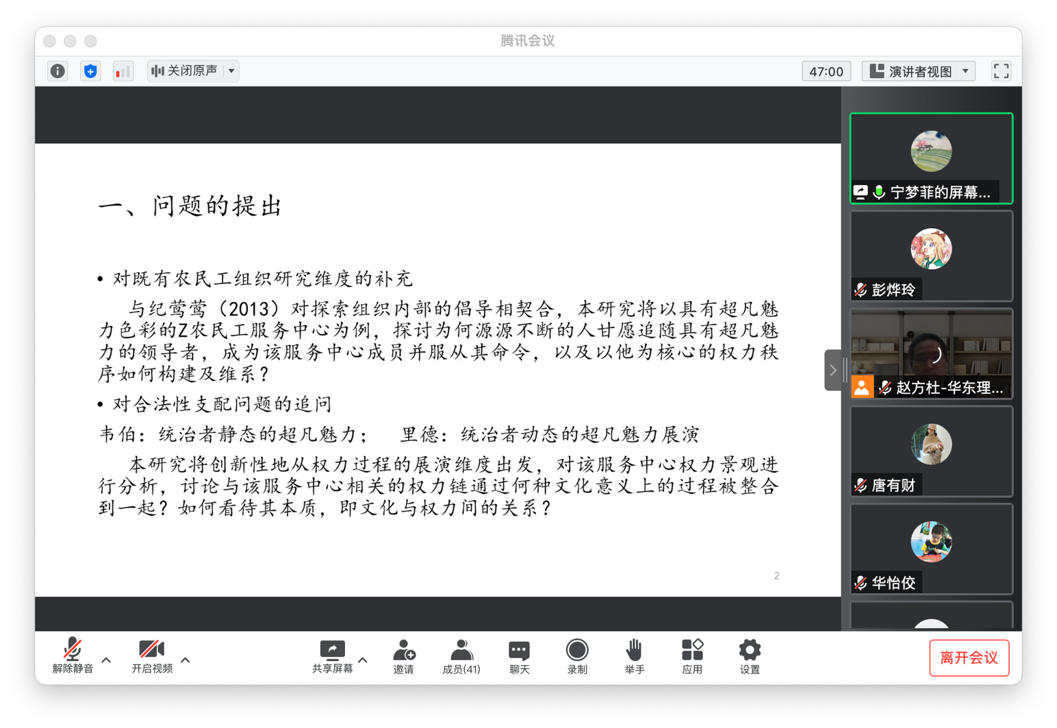 2021级博士生宁梦菲汇报的题目是“超凡魅力展演:社会组织中权力景观的构建及维系机制”。宁梦菲同学针对农民工内外部转型路径与治理等问题,从权力过程的展演维度出发,使用里德超凡魅力展演”和“权力链”理论,对农民工服务中心权力景观进行了分析。认为服务中心通过螺旋式成功展演,形成了以王先生为核心的同心圆式权力网。该研究弥补了里德忽视展演关系的不足,呈现了组织中的多重权力链与情境脉络。唐有财教授认为,该选题极具价值,但是还存在一定不足:1.该研究太过于结果论,还应进一步深入到组织内部去看,为什么这样一个组织里面需要一个克里斯马权威类型,去看看组织内部是如何运作的。2.农民工组织的构建方式是怎样的需要探讨,是内部形成的?还是外部建构形成的?或者是二者共同产生的?由此可以为该种权威的形成提供解释。