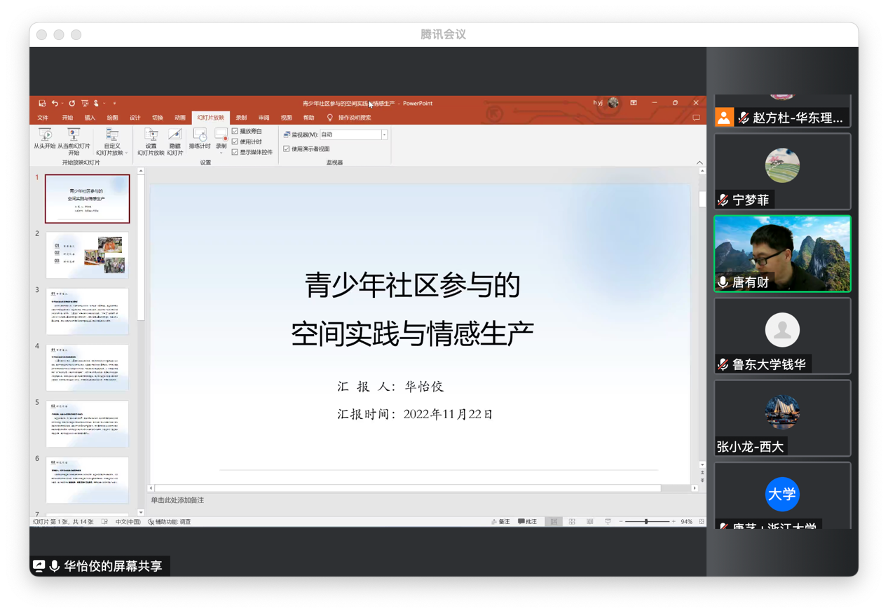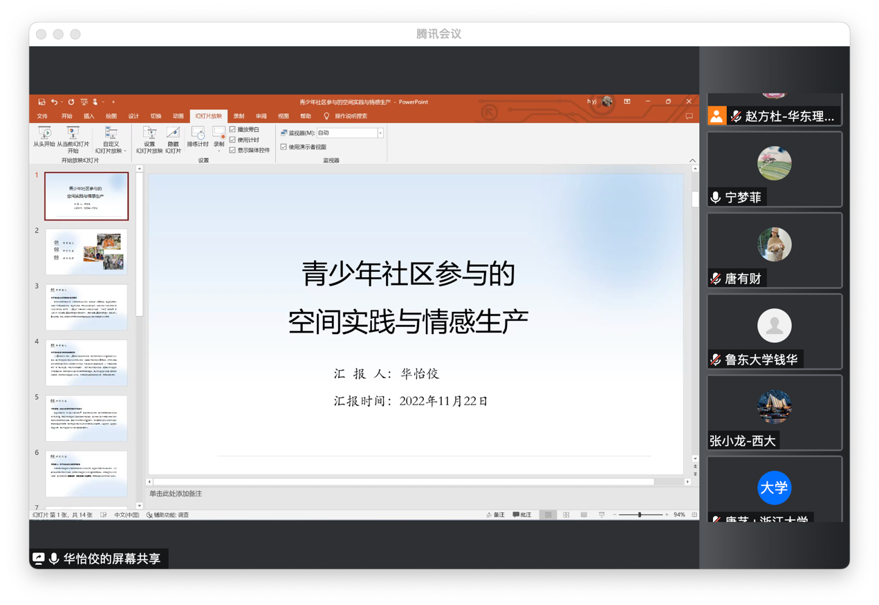 2021级博士生华怡佼汇报的题目是“社区治理视域下的青少年志愿服务参与机制”。该研究从个体在场、情感展演与空间实践的方面,对青少年社区参与进行了分析。唐有财老师认为该研究有一定意义,但仍存在以下不足:1.该研究缺乏清晰的问题意识,缺少相关理论对话、实证资料与论证,在后续研究中还需不断补充材料厘清研究问题。2.该研究的研究对象还需要进一步界定,研究中青少年年龄阶段存在混乱,包括了儿童、少年、青年等,但是他们在社会化过程中具有不同其自我意识、其社会参与的主题也不一,很难笼统来说。总体而言问题未出,调研和论证还不够,应当深度跟踪介入。