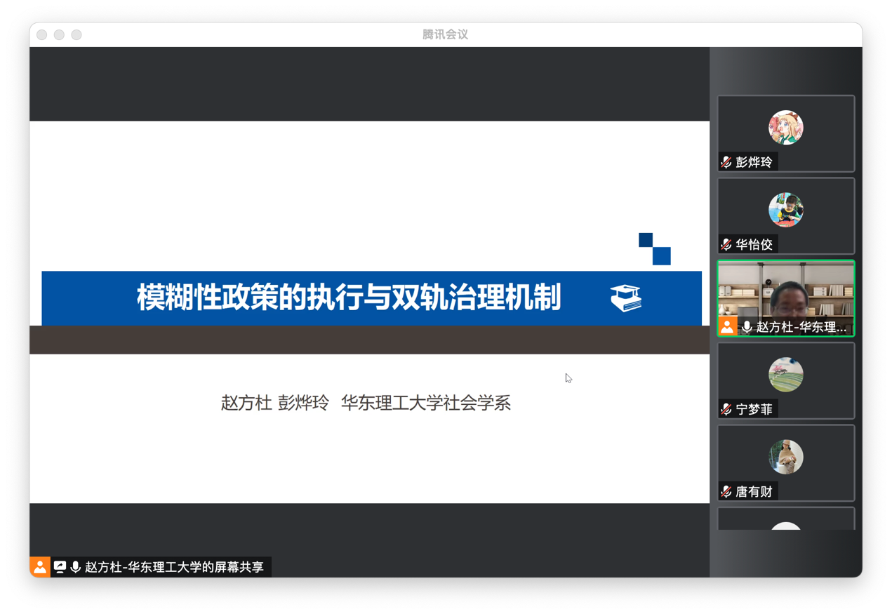 社会学系教师赵方杜做了“模糊性政策的执行与双轨治理机制”的报告,以“乌卡时代”公共政策模糊性的增强为研究背景,使用马特兰德“模糊-冲突”模型,对“政策找人”这一模糊性公共政策的执行进行了分析。该研究以政策执行的传递过程为主要线索,将不同层级的政策执行及其转化机制进行了深入探讨,对“模糊-冲突”模型结合双轨治理进行了适应性修正,展示了模糊性政策的执行路径。唐有财老师认为该研究有一定启发性。提出了以下不足与思考:1.双轨的概念在此处需要谨慎提出,双轨是从国家与社会的层面讨论的,但该体制还是在国家政权体系中进行的;2.大部分政策从上往下都是模糊性的,但是不是模糊政策在下面都会产生这样的执行结果?需要思考在较上政策执行层中的阻碍,为什么上层会层层把压力强加给基层。并且这类资料的调研应该往市、区层面,但是这些资料难以调研到。3.对政策来源本身也值得思考,哪个部门推行的政策对基层具有不同的激励性。基层对政策执行的看重需要看哪个部门向下推进,比如说组织部门、经济部门激励性强,对下层级的重要性也强。