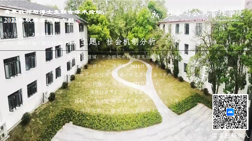 2022年11月22日下午13:30,由BETVICTOR伟德主办的青年教师与博士生联合学术论坛2022年秋季学期第六期在线上举行,主题为“社会机制分析”。此次论坛由社会学系赵方杜老师主持,人文社科处副处长、社会学系唐有财教授担任点评专家,来自校内外的近50余名师生参加论坛。本次论坛主要由四位师生进行交流分享。