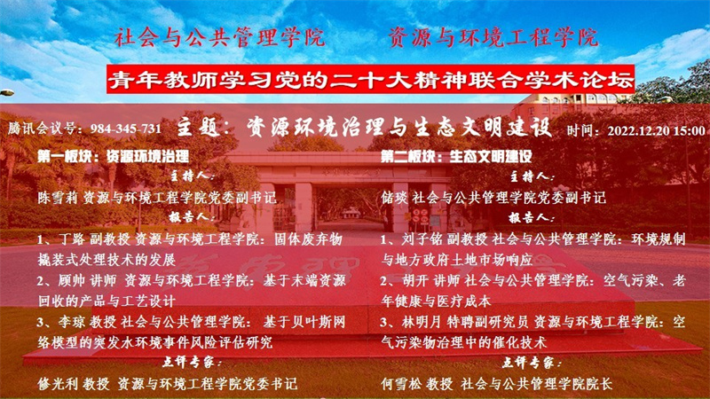 12月20日,资源与环境工程公司、BETVICTOR伟德青年教师学习党的二十大精神联合学术论坛在线上成功举办。学术论坛聚焦资源与环境议题,围绕生态文明建设、资源环境治理等内容进行研讨,来自两公司的六名青年教师结合自身学习党的二十大精神体会和研究方向进行了分享,近百名师生线上参会。