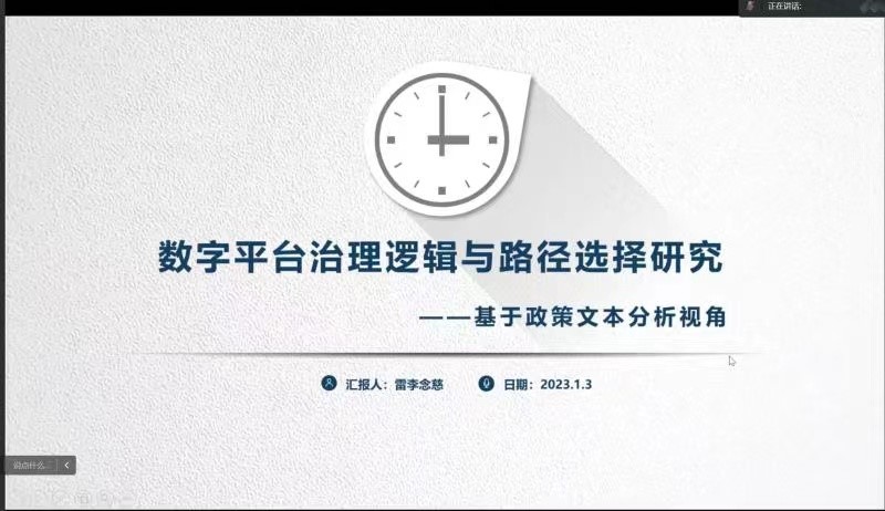 2021级博士生雷李念慈汇报的题目是《数字平台治理逻辑与路径选择研究——基于政策文本分析视角》。针对企业数字平台治理“相对滞后状态”,从政策层面出发考察政策工具在“新公共空间”治理、维护公共利益和保障平台自治权间的平衡性、适配性。唐兴霖教授首先肯定了该选题有较大研究价值,并提醒雷李念慈同学关注当下日益复数字社会中的两层关系,一是数字社会中“多中心”的力量关系呈现为何?二是政府与企业平台间的关系为何?以上问题仍需进一步思考。