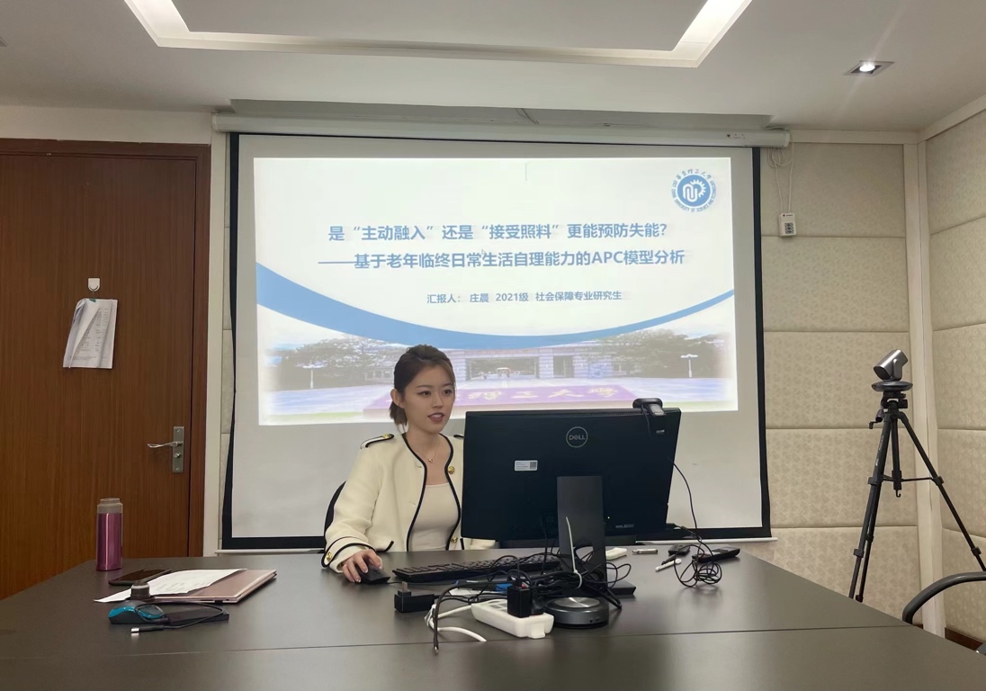 社会保障专业2021级硕士生庄晨同学汇报的主题为:是“主动融入”还是“接受照料”更能预防失能?——基于老年临终日常生活自理能力的APC模型分析。报告基于了我国积极老龄化背景下,我国老年失能人口规模之大的问题展开了讨论。报告研究了我国老年失能程度在年龄等不同时间维度上的变化规律,同时引入社会参与和照料方式的概念,探究两因素与老年人失能程度的关系影响,最终对我国的积极老龄化战略实施、老年照护体系完善等提出了相关政策启示。