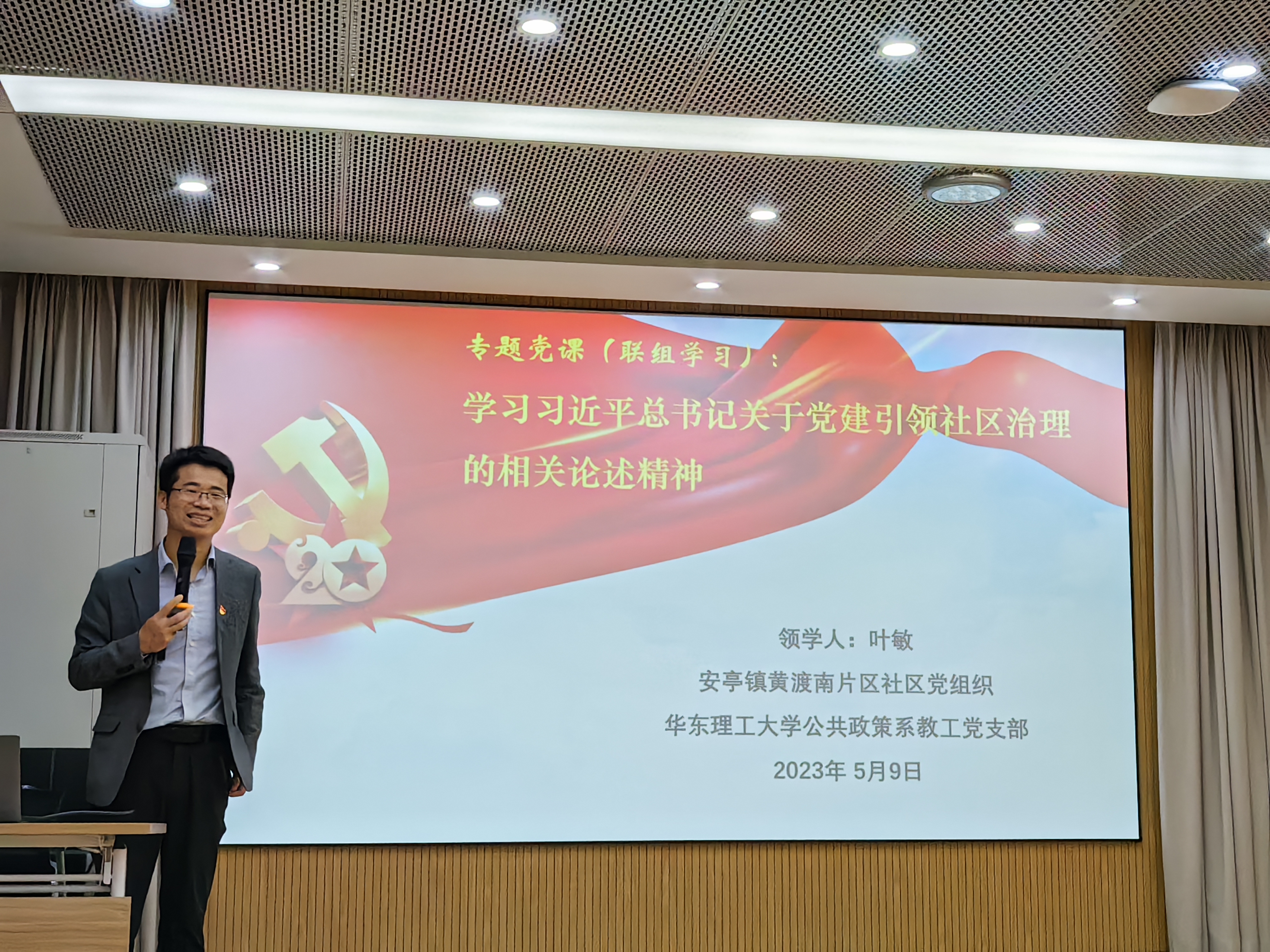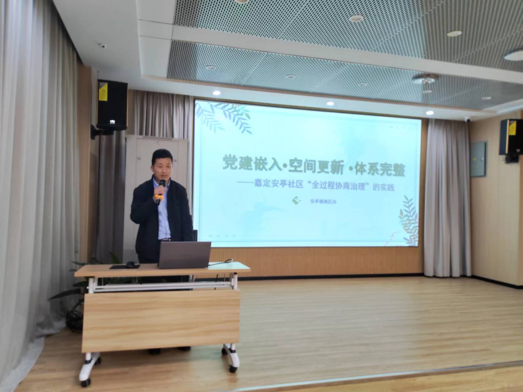 公共政策系教工党支部书记叶敏教授作为领学人分享了习近平总书记关于党建引领社区治理相关重要论述的学习体会。安亭镇地区办党组织书记尚嘉坪作了“党建嵌入·空间更新·体系完善——嘉定安亭社区‘全过程协商治理’的实践”的典型经验介绍。
