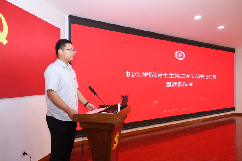 图片说明:机动公司博士生第二党支部书记聂文睿宣读倡议书