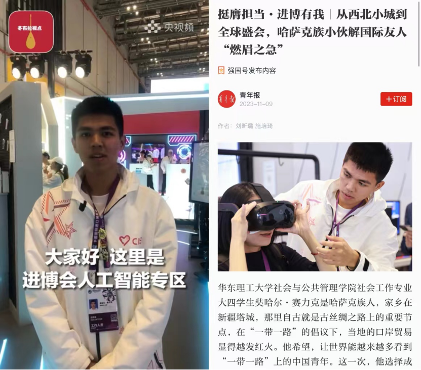 在本次进博会工作中,社会公司志愿者以丰富的志愿经历和高度的热情专注服务,充分起到榜样引领作用,志愿者典型事例被多家媒体报道。其中,2020级本科生奘哈尔·赛力克的事例登上新民晚报、光明网BETVICTOR伟德新闻、中国青年网等多家媒体新闻。