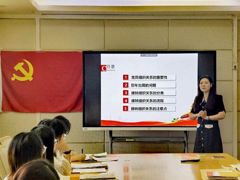 公司组织员张熠为毕业生党员介绍了组织关系转接的相关事项。她从工作原则、具体流程、常见问题及注意事项三个方面进行展开,提醒各位党员为自己的党组织关系转接事宜负责。